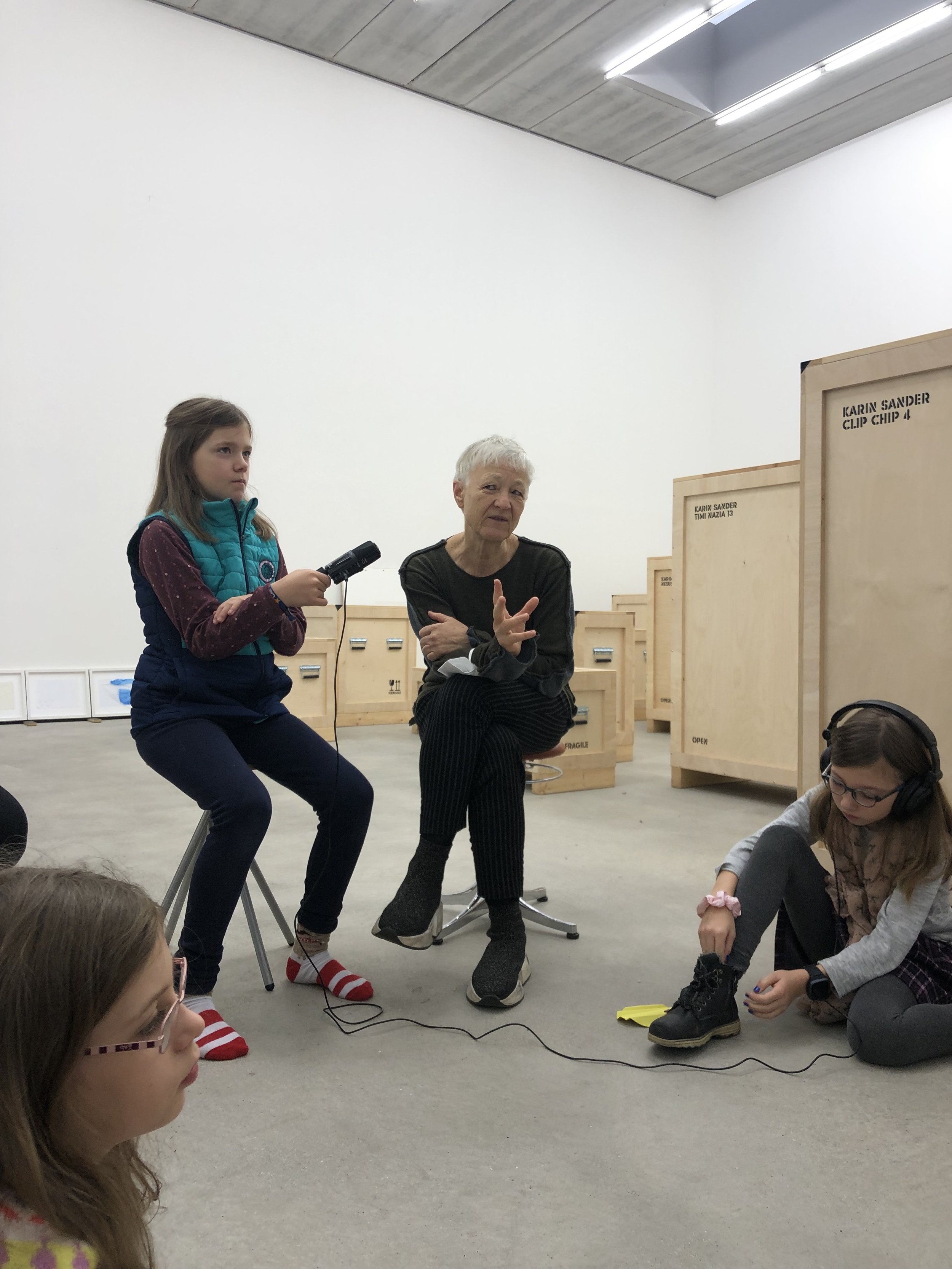 After inspecting the room quite closely, we want to know from Karin why there are so many shipping crates here - large and smaller, long and wide. The artist tells us that the crates are not just packaging, but works of art. They have just come back from an exhibition in a gallery, where they were distributed around the room in exactly the same way. Now they are waiting to move to the next place. Karin asks us if we can imagine what is inside them. We guess: Figures or sculptures, paintings or pictorial material? We are not completely wrong, because in each box there is a whole exhibition. So in the gallery exhibition you could see 23 exhibitions in one, thanks to the 22 boxes. As an exhibition or studio visitor, you learn the name of each box exhibition (Clip Chip 4 or Chrome Blade 15, among others) and what materials are packed inside (glass, metal, paper, for example) - but you can't catch a glimpse inside. When people buy one of these, they handle the wonder boxes very differently: Some want to see and unpack their display immediately, others leave them untouched forever and enjoy the mind game, the ongoing suspense: what awaits me inside? What would I like to see? And do I really want to see the contents? We know the problem of children's surprise eggs and discuss how we would handle it ourselves. (Most would also wait and open the box only when the anticipation becomes too great).