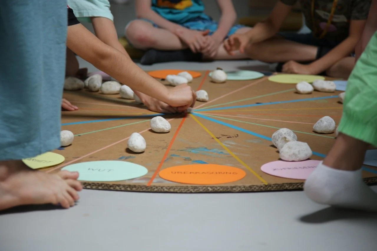 The wheel of emotions records many different feelings. At the beginning and end of each workshop, after a short breathing exercise, the children place themselves on the wheel with the help of a stone. They are then given the opportunity to talk about their own feelings. The wheel also makes the feelings of others visible and easier to understand.